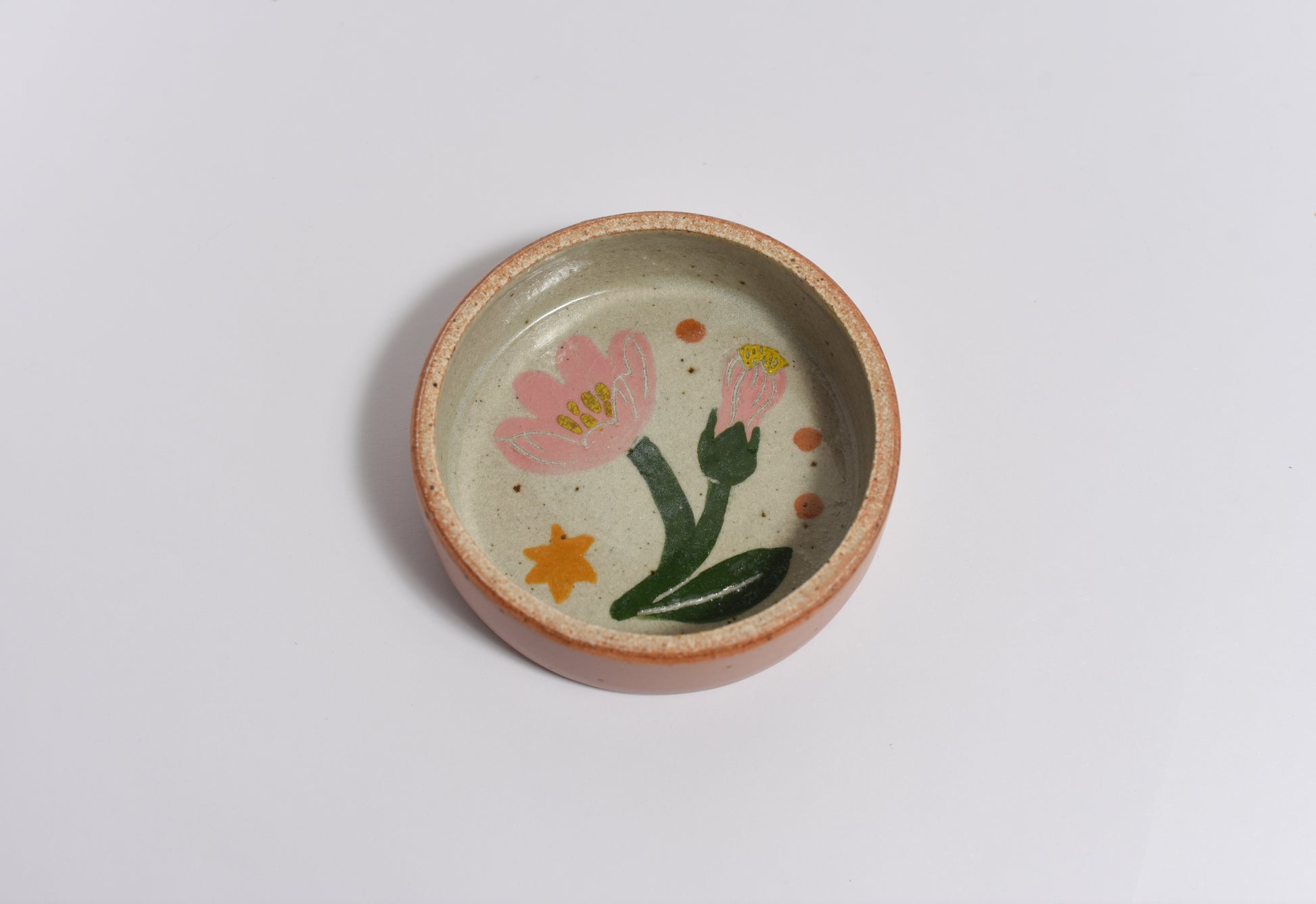 The perfect size for all your small belongings, this cute and bright catchall is a cute detail for any room. Use it for small trinkets or spices in the kitchen. Pink exterior glaze.